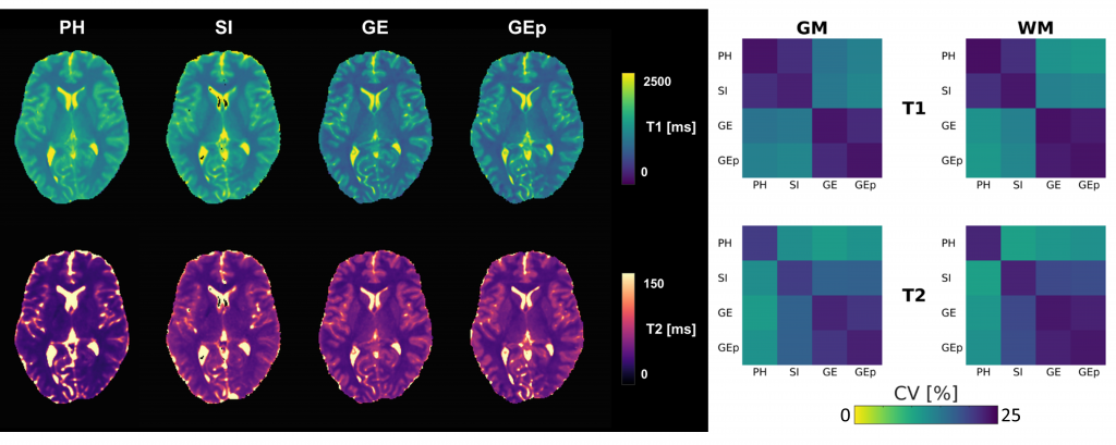 This work aimed to assess accuracy, repeatability, and inter-vendor reproducibility of jointly measured T1 and T2 maps based on TSR at 3T. To achieve this goal, a phantom and five volunteers were scanned in a traveling-brain study at four 3T MRI systems from three manufacturers.