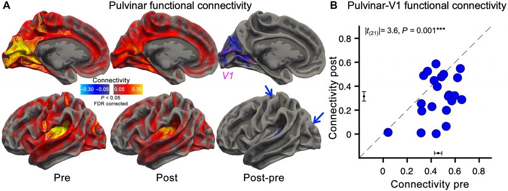 ABSTRACT: In normally sighted human adults, 2 hours of monocular deprivation is sufficient to transiently alter ocular dominance. Here, we show that this is associated with a reduction of functional connectivity between the pulvinar and primary visual cortex (V1), selective for the pulvinar-to-V1 directionality. Across participants, the strength of the pulvinar-to-V1 connectivity was negatively correlated with the ocular dominance shift, implying less plasticity in participants with stronger influence of the pulvinar over V1. Our results support a revised model of adult V1 plasticity, where short-term reorganization is gated by modulatory signals relayed by the pulvinar.