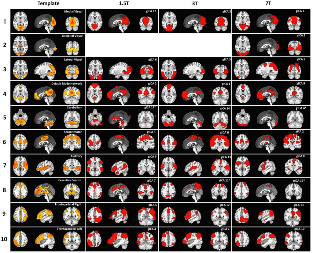 ABSTRACT: Resting-state fMRI functional connectivity analysis is usually performed with seed-based methods that strongly rely on user-dependent definitions of regions of interest. Data-driven methods like independent component analysis (ICA) can mitigate this need. However, the number of components that should be expected in an fMRI acquisition, which determines the model order of the ICA, is not defined, and it is not uniformly chosen across studies. This variability is further complicated by the dependence of component number on field strength, with higher field strengths typically yielding more detectable components. Therefore, relying on a predetermined number may influence the results. Here, we compare functional maps obtained through ICA analysis at different magnetic field strengths and at various levels of spatial detail. Our results confirm the presence of the most frequently reported resting-state networks across field strengths and demonstrate that higher magnetic field strength enables more robust detection of functional networks with greater spatial detail. We also show that: (1) fixing the number of components, although improving interpretability of group results, may provide an incomplete picture of brain function; (2) a greater number of components is consistently identified at higher field strength, suggesting that the model order should be adapted according to both field strength and spatial detail.